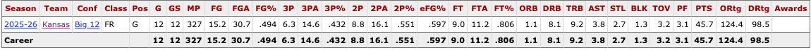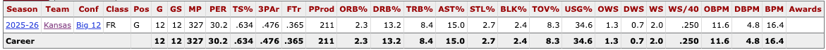 Torvik BPM: +14.8 overall (doesn’t meet Torvik’s 40% of team minutes qualifying bar but would be 3rd only behind Cam Boozer and Yaxel Lendeborg if he did), +10.8 off, +4.0 def